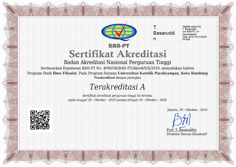 Setelah menerima visitasi para asesor pada Jumat, 25 Oktober 2019, Program Studi Ilmu Filsafat (Sarjana), Fakultas Filsafat, UNPAR, memperoleh nilai akreditasi ‘A’. Pencapaian ini tercantum dalam Sertifikat Akreditasi berdasarkan Keputusan BAN-PT No. 4090/SK/BAN-PT/Akred/S/X/2019. Di bawah ini terlampir foto-foto selama visitasi tersebut.