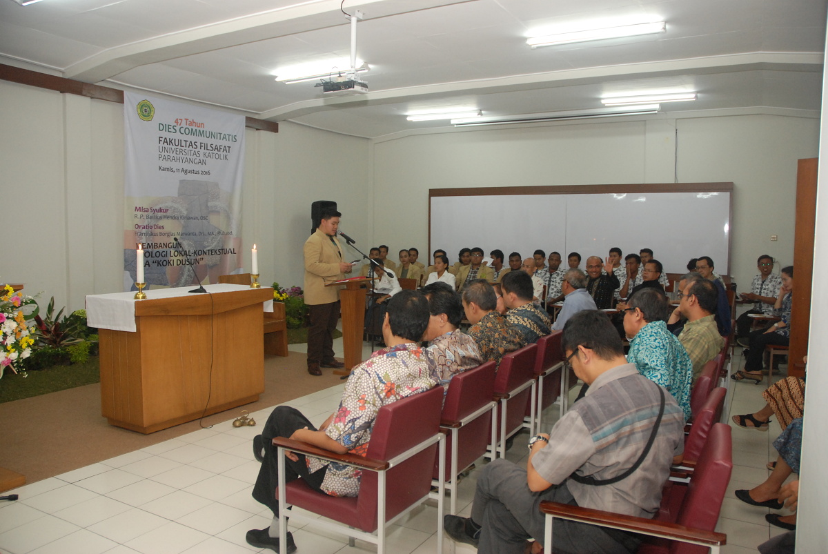 Dies Natalis di FF, UNPAR, dinamai “Dies Communitatis”, pada 2016 yang lalu dilaksanakan pada 11 Agustus. Acara ini dimulai dengan Misa Syukur dipimpin oleh RP. B. Hendra Kimawan, OSC, dan dilanjutkan dengan Oratio Dies oleh F. Borgias Marwanta, Drs., MA., Ph.D.,abd. Orasi berjudul “Membangun Teologi Lokal-Kontekstual ala ‘Koki Dusun'”. Acara ini dihadiri juga oleh Rektor UNPAR, Mangadar Situmorang, Ph.D.