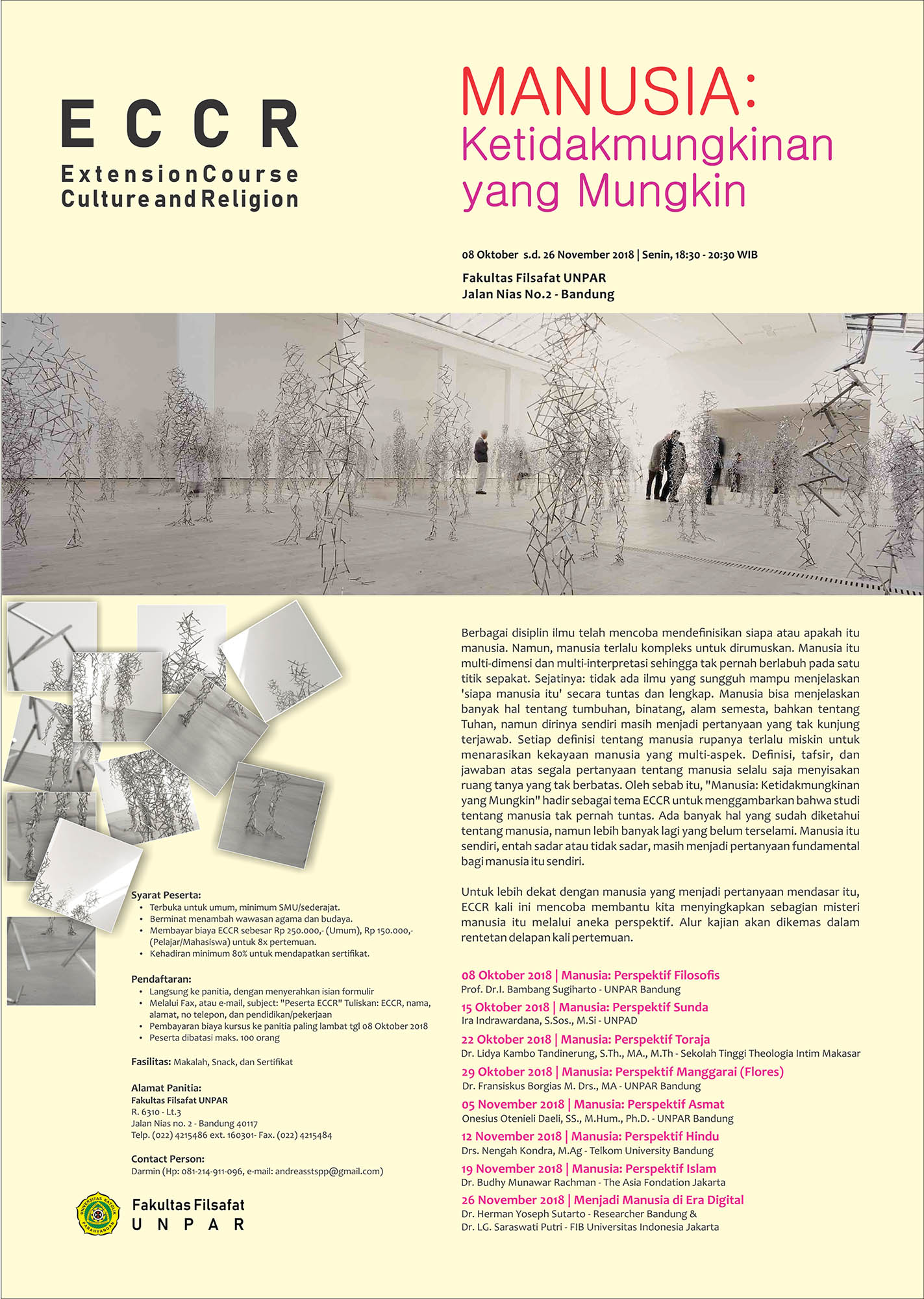 ECCR (Extension Course Culture & Religion) di Fakultas Filsafat, UNPAR, dengan tema “Manusia: Ketidakmungkinan yang Mungkin” diselenggarakan pada 8 Oktober hingga 26 November 2018. Para pengajarnya ialah Dr. Herman Yoseph Sutarto, Dr. LG. Saraswati Putri, Dr. Budhy Munawar Rachman, Drs. Nengah Kondra, M.Ag, Onesius Otenieli Daeli, Ph.D., Dr. Fransiskus Borgias M, Dr. Lidya Kambo Tandinerung, Ira Indrawardana, S.Sos, M.Si, dan Prof. Dr. I. Bambang Sugiharto.
