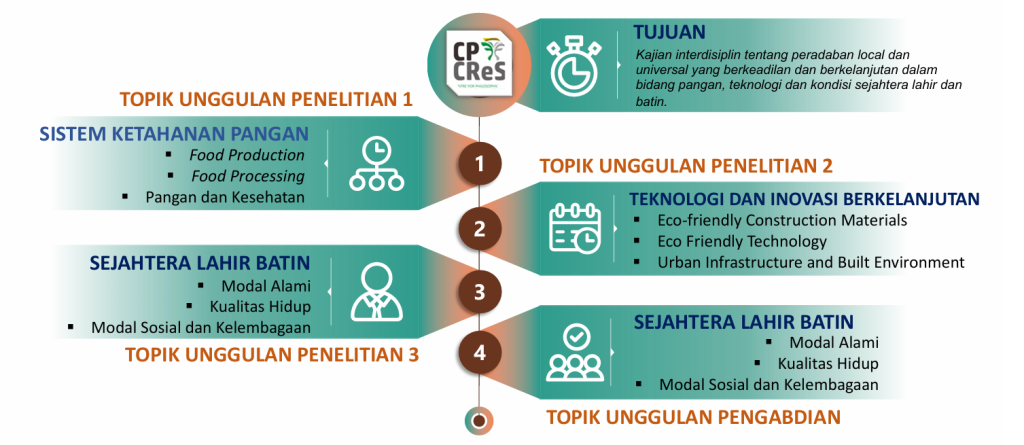 Kajian interdisiplin tentang peradaban local dan universal yang berkeadilan dan berkelanjutan dalam bidang pangan, teknologi dan kondisi sejahtera lahir dan batin.
