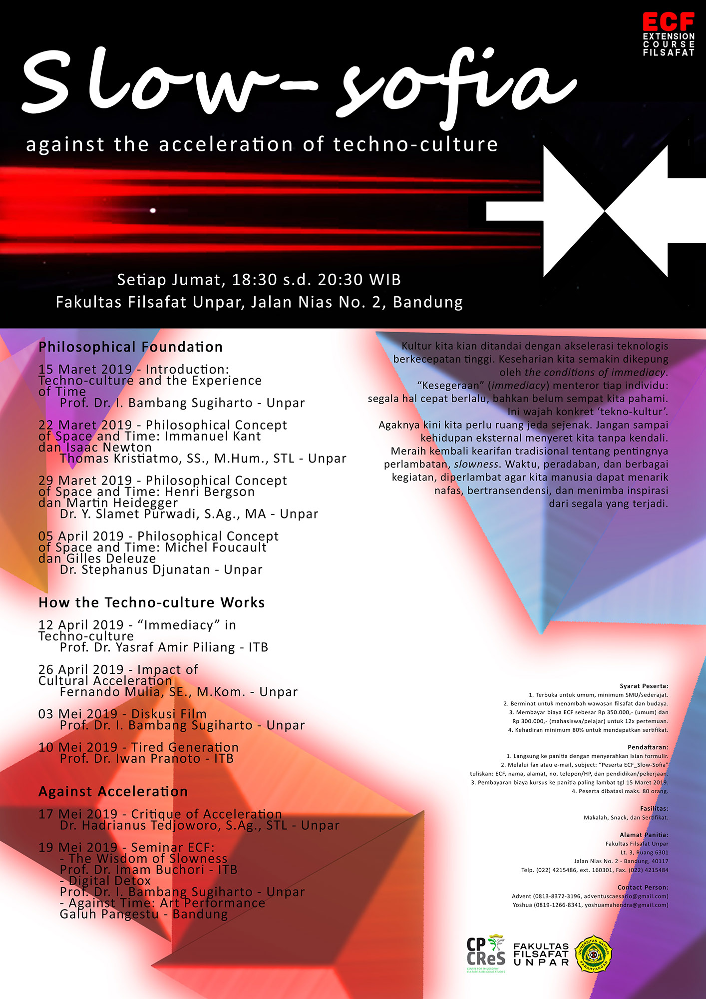 Extension Course Filsafat (ECF) edisi semester genap 2019 diorganisasi oleh Pusat Studi Filsafat, Kultur, dan Studi Religi (CPCReS) Fakultas Filsafat UNPAR setiap Jumat pk 18.30-20.30 di kampus FF, Jl. Nias 2, Bandung, dari 15 Maret 2019 hingga diakhiri dengan Seminar ECF, 19 Mei 2019. Seminar ECF mendatangkan pembicara Prof. Dr. Imam Buchori (“The Wisdom of Slowness”), Prof. I. Bambang Sugiharto (“Digital Detox”), dan Galuh Pangestu (” Against Time: Art Performance “).