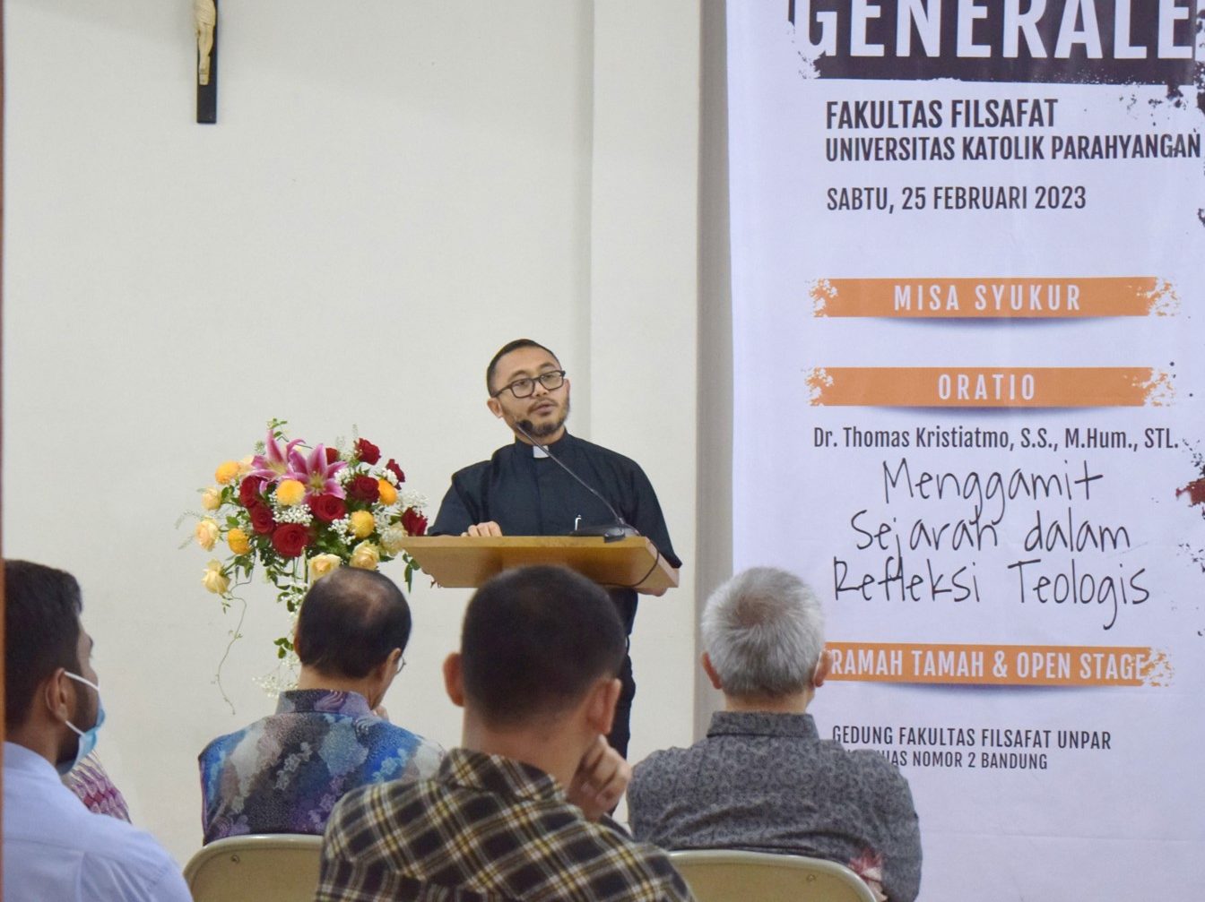 “Yang dibutuhkan itu bukan saja summa teologia, tapi yang dibutuhkan untuk masyarakat atau berteologi adalah summa sociologia,” tutur Kristiatmo ketika menyampaikan oratio berjudul “Menggamit Sejarah dalam Refleksi Teologis” dalam Studium Generale di Fakultas Filsafat Universitas Katolik Parahyangan, Jalan Nias Nomor 2, Kota Bandung, Sabtu (24/2/2023).