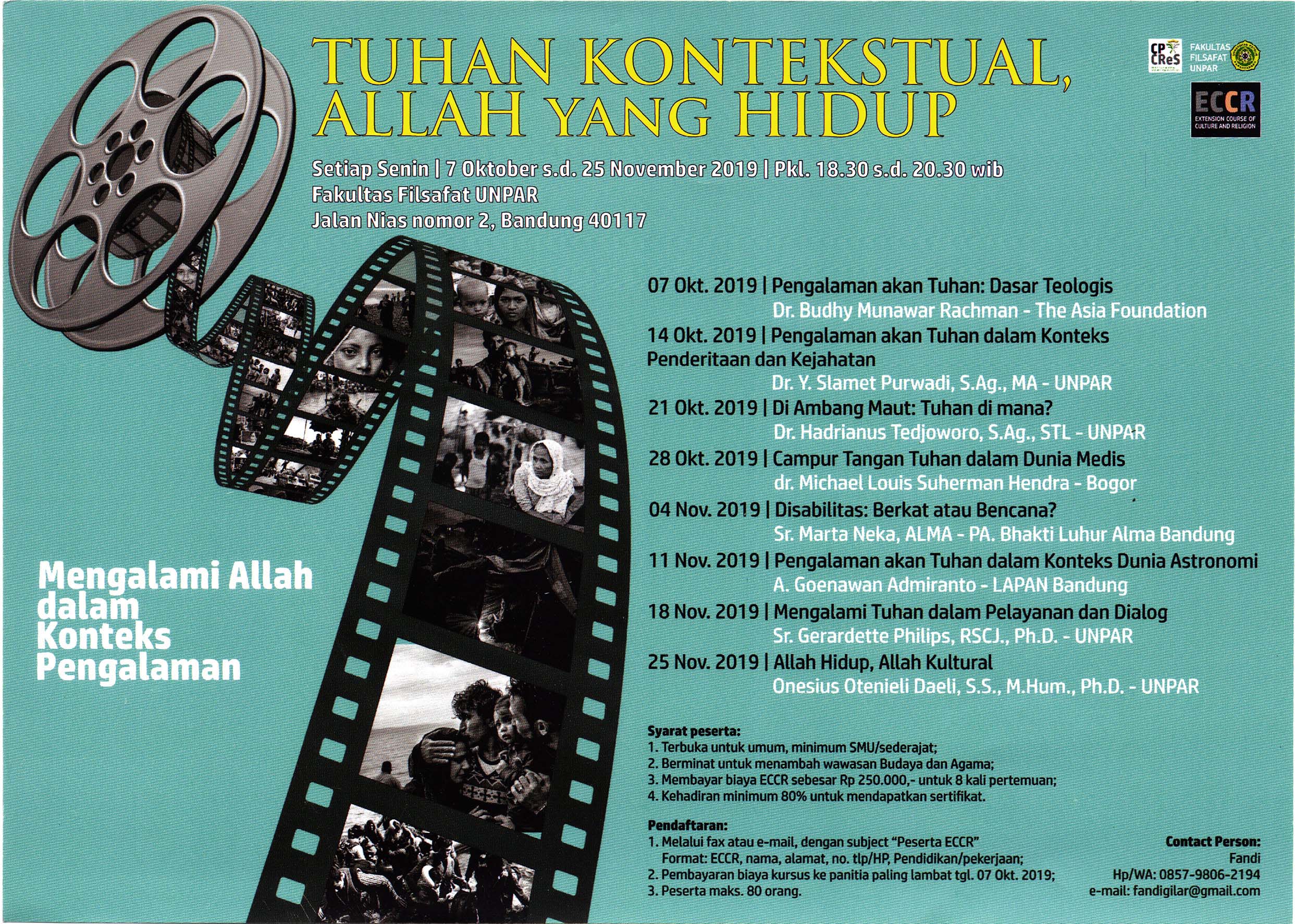 “Mengalami Allah dalam Konteks Pengalaman”. Begitulah tagline Extension Course of Culture and Religion (ECCR) yang diorganisasi oleh Centre for Philosophy, Culture, and Religious Studies (CPCReS) Fakultas Filsafat UNPAR. Tema “Tuhan Kontekstual, Allah yang Hidup” diangkat sebagai benang merah kursus di semester ganjil ini, berlangsung dari 7 Oktober hingga 25 November 2019.